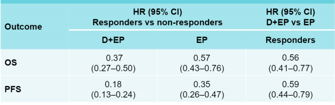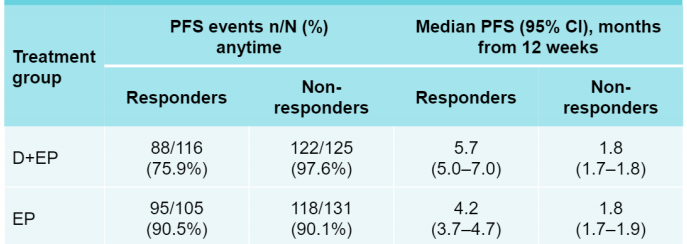 此外,多变量模型分析发现,第12周时的缓解(OS和PFS的p值<0.001)以及治疗和缓解的交互项(用于测量D+EP组和EP组之间缓解对生存期影响程度的不同;OS的p值为0.023,PFS的p值为0.004),均与较长的OS和PFS显著相关。
