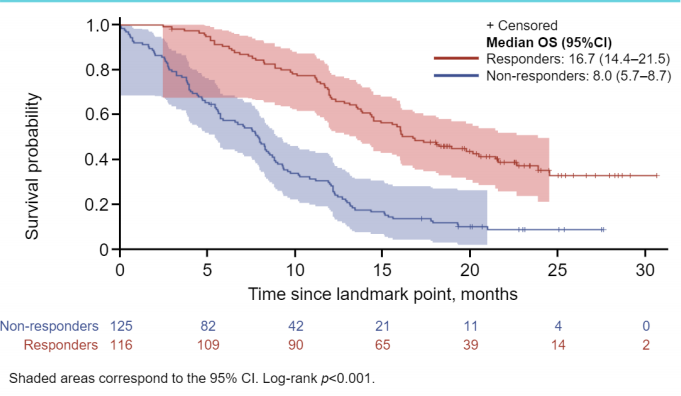 每个治疗组中,应答者的OS率和PFS率均显著高于无应答者(每个治疗组的OS和PFS均为p<0.001)。