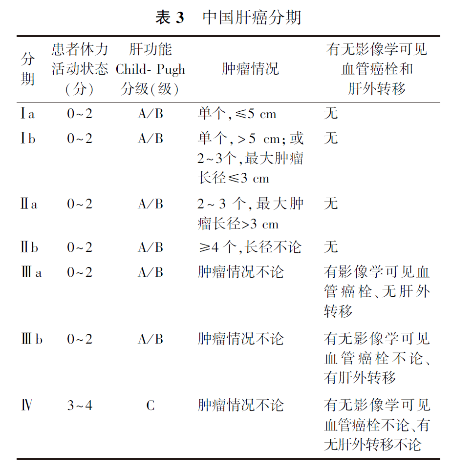 (2)CNLC:国家卫生健康委员会2022年发布的《原发性肝癌诊疗指南(2022年版)》结合中国的具体国情及实践积累,依据患者体力活动状态、肝肿瘤及肝功能情况等情况,制定了CNLC,将肝癌分为Ⅰ~Ⅳ期,详见表3。