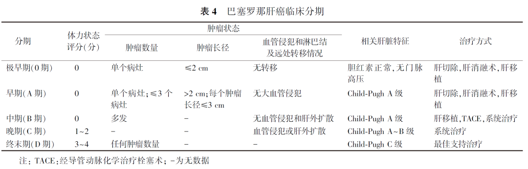 (3)BCLC:BCLC肝癌临床分期系统最早于1999年提出,后经美国肝脏疾病研究协会不断进行修改,2022版BCLC将肝癌分为极早期、早期、中期、晚期和终末期,详见表4。