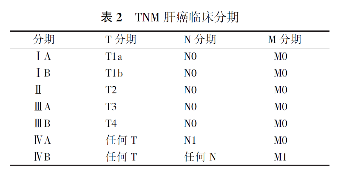 (1)TNM分期:美国癌症联合委员会(American Joint Committee on Cancer, AJCC)TNM分期系统(第8版)将肝癌分为Ⅰ~Ⅳ期,其分期细化定义如下:①原发肿瘤(T):pTx:原发肿瘤不能评估;pT0:无原发肿瘤的证据;pT1:单个肿瘤长径≤2 cm或单个肿瘤长径>2 cm无血管侵犯(T1a:单个肿瘤长径≤2 cm;T1b:单个肿瘤长径>2 cm无血管侵犯);pT2:单个肿瘤长径>2 cm伴有血管侵犯,或多个肿瘤长径均≤5 cm;pT3:多个肿瘤,至少1个肿瘤长径>5 cm;pT4:任何大小单个或多个肿瘤侵犯门静脉或肝静脉的主支(左、右门脉,左、中、右肝静脉),或肿瘤直接侵犯除胆囊外的其他邻近器官,或穿透脏层腹膜。②区域淋巴结(N):Nx:区域淋巴结无法评估;N0:无区域淋巴结转移;N1:区域淋巴结转移(肝门、肝十二指肠韧带、膈下、腔静脉淋巴结转移,出现即Ⅳ期)。③远处转移(M):M0:无远处转移;Mx:远处转移无法评估;M1:远处转移。详见表2。