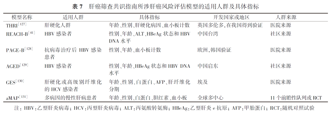 目前,仅有我国的《原发性肝癌的分层筛查与监测指南(2020版)》推荐了根据不同病因和疾病状态分别利用不同风险评估模型进行高危人群分层,《中国肝癌早筛策略专家共识》和《原发性肝癌二级预防共识(2021年版)》也推荐参考《原发性肝癌的分层筛查与监测指南(2020版)》进行高危人群分层。此外,日本肝病协会发布的指南也建议了根据肝硬化和合并病毒感染与否进行风险辨识的方法,具体内容详见表6。在《原发性肝癌的分层筛查与监测指南(2020版)》中推荐的筛查模型分别针对肝硬化患者(THRI模型)和HBV感染者(REACH-B模型、PAGE-B模型以及AGED模型),尚无单独针对HCV感染者的风险评估模型。由于HCV感染者主要是在肝硬化背景下才发生肝癌,有学者针对伴有肝硬化或高级别纤维化的HCV感染者构建了GES风险分层模型。2020年,我国研究者利用全球11个前瞻性队列共17374例患者,构建了首个跨病因(慢性乙型肝炎、慢性丙型肝炎、非病毒性肝病等)、跨种族(亚洲人、西方人等)针对慢性肝病患者的肝癌风险预测评分aMAP模型。模型由患者年龄、性别、血小板计数、白蛋白和胆红素5个指标构成,总分为100分,aMAP评分<50分的患者归为低危险组,其HCC年发生率为0~0.2%;aMAP评分50~60分为中危组,其HCC年发生率为0.4%~1.0%;aMAP评分>60分为高危组,其HCC年发生率为1.6%~4.0%。在HBV队列及各种不同肝病队列中,aMAP评分的预测能力均显著高于其他现有HCC风险评分模型,且在慢性乙型病毒性肝炎和慢性丙型病毒性肝炎人群的外部验证中,aMAP评分均取得了较好的预测能力。推荐模型的适用人群和评估指标等详见表7。在国家卫生健康委员会2022年1月17日发布的《原发性肝癌诊疗指南(2022年版)》中,也推荐了使用aMAP评分进行肝癌高风险人群的分层。但目前尚无aMAP评分针对肝癌高危人群的广泛验证或RCT筛查研究等高质量证据,因此,需要继续以中国人群的肝癌筛查数据为基础,评估aMAP评分模型的作用。