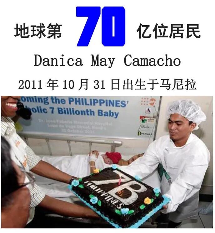 2011年10月31日,一个名叫Danica May Camacho的女孩降生在菲律宾马尼拉市,象征性成为地球第70亿位居民。联合国官员按例探访了这名女婴和她的家人,这一天定为“世界70亿人口日”。同日,来自孟加拉国的女孩萨蒂亚·苏丹娜·沃施也象征性成为地球第70亿位居民。萨蒂亚如今生活在孟加拉国首都达卡郊区,她还有两个姐姐,自己立志当医生。![]()