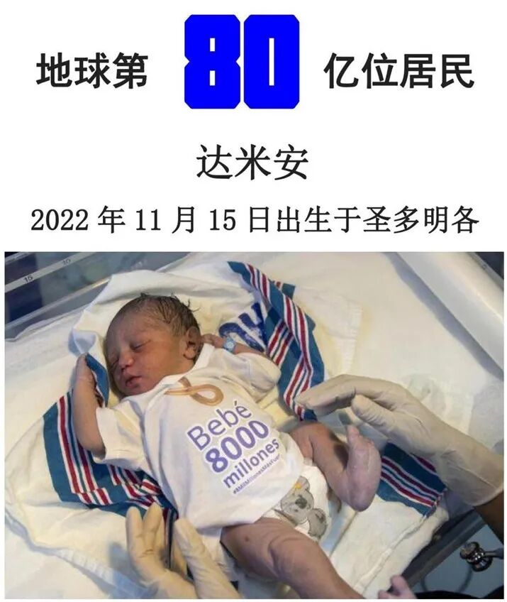 2022年11月15日,多米尼加共和国圣多明各一家妇产医院迎来一个名字为达米安的婴儿,成为全球人口总数迈过80亿大关的象征。当然,达米安作为地球第80亿个居民的身份光环是象征性的,谁也无法准确弄清地球第80亿个居民究竟是谁。联合国人口基金会驻多米尼加共和国代表索尼娅·巴斯克斯表示,这个婴儿的到来代表着“寄托在所有降临这个星球的孩子们的殷切希望……这就是我们所努力追求的,实现孕产妇零死亡、零发病率、零疾病和健康”。