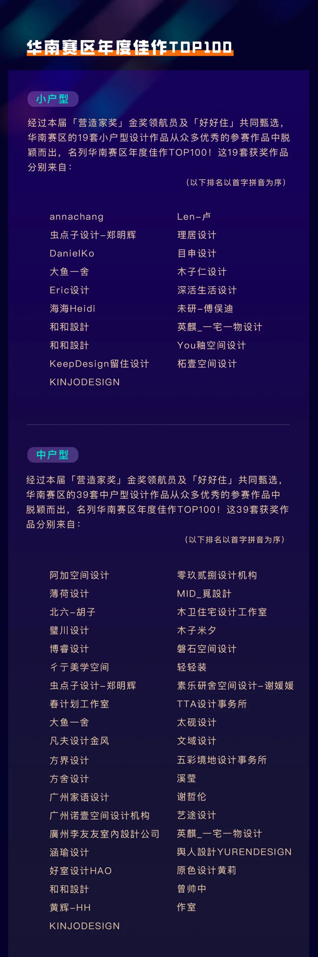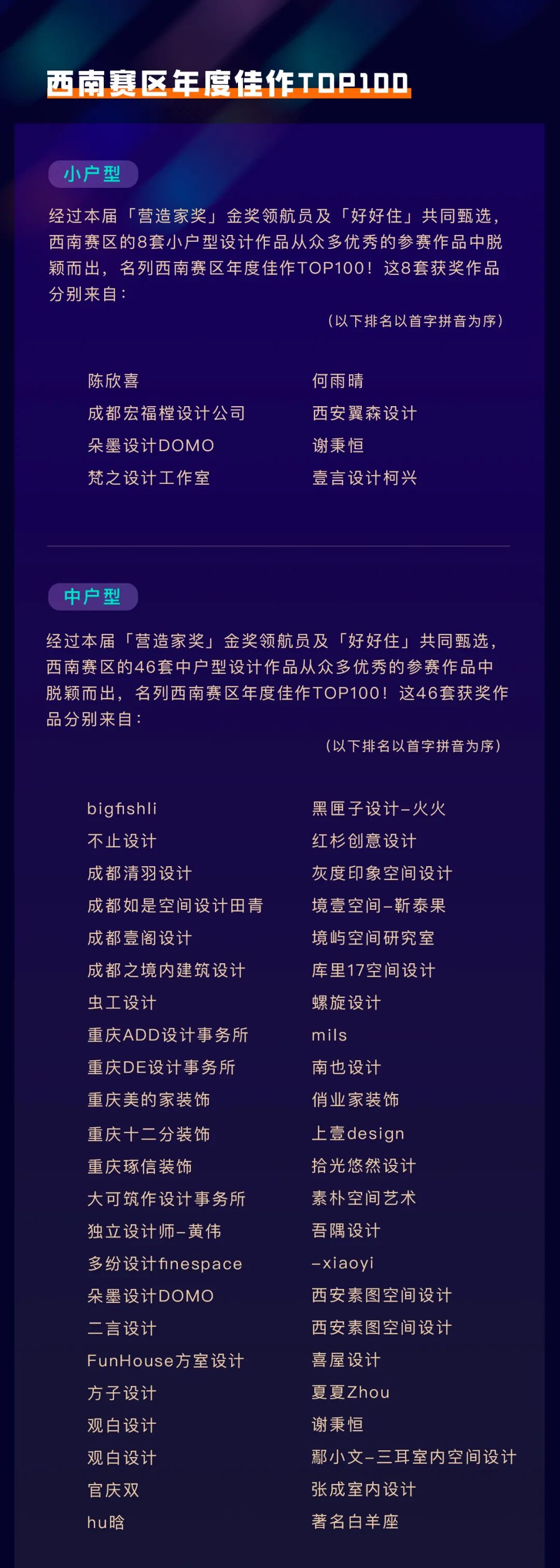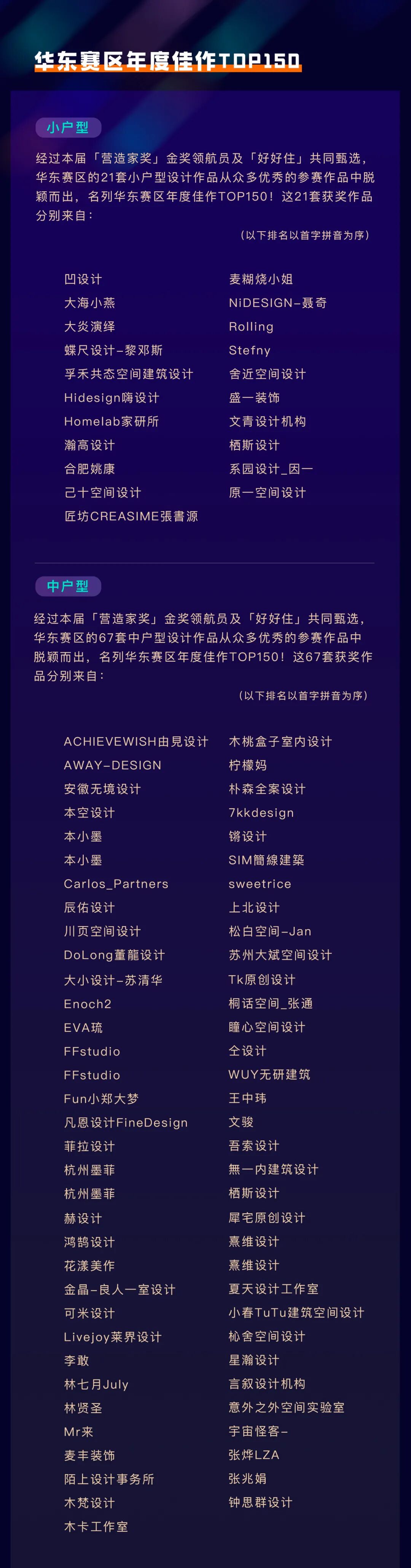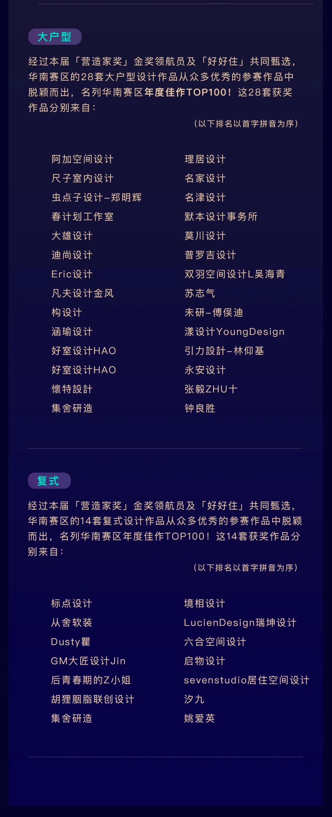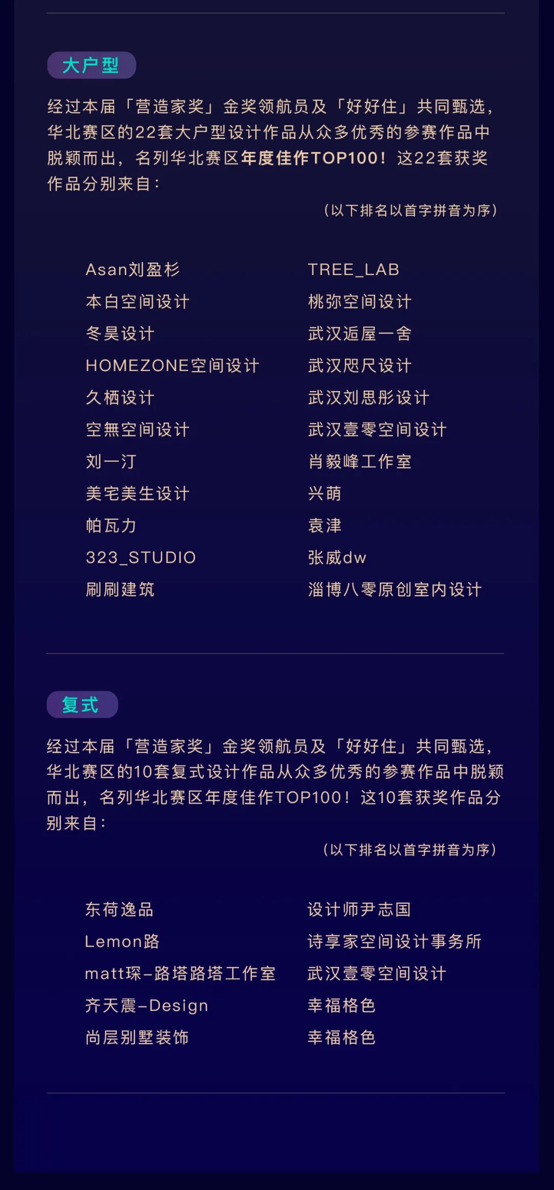 经过长达4个多月的火热报名,由好好住主办,西门子家电总冠名,伟星管道和爱普生中国联合赞助的2020「营造家奖」受到了广大设计师朋友们的热情支持,截止到报名结束,本届大赛一共收到了来自全国各地3033位设计师7720套优秀作品!经2020「营造家奖」金奖领航员和好好住严谨又专业的共同甄选,四大赛区年度佳作TOP450已出炉!这450套作品不仅是本届「营造家奖」最优秀的参赛作品,更是从某种程度上代表了中国私宅设计领域的最高水准!恭喜各位获奖设计师!![]()