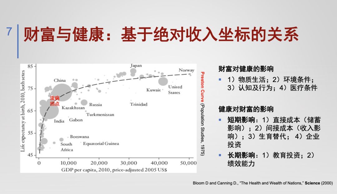 如果把财富和健康两条主线连在一起并放在一个坐标系里,就会清晰地看到一条抛物型曲线,人均收入逐渐提升,人均期望寿命也是从低往高走。不过值得注意的是,随着健康寿命的提高和收入水平的增长,在比较高的收入水平时,再提升相应程度的话,人们获得的健康方面的回报则逐渐减小,可见边际报酬递减的铁律对人类财富与健康的关系仍然有约束作用。