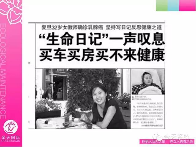 影响女性健康与生命的两大杀手:宫颈癌与乳腺癌。梅艳芳、李媛媛正是宫颈癌剥夺了她们年轻的生命,陈晓旭(林黛玉扮演者)也是由于乳腺癌香消玉殒,令人倍感惋惜,回头想想难道她们没有钱吗?当然不是!是她们疏忽了生殖系统健康的保养和预防。