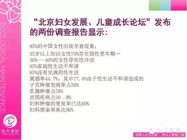 女性生殖系统黑色亚健康报告:已婚女性妇科疾病发病率为96%以上,由此引发的面色晦暗、色斑、皱纹、腰膝酸软、月经失调、内分泌失调、白带增多、身体局部发胖等症状就占到97%;
