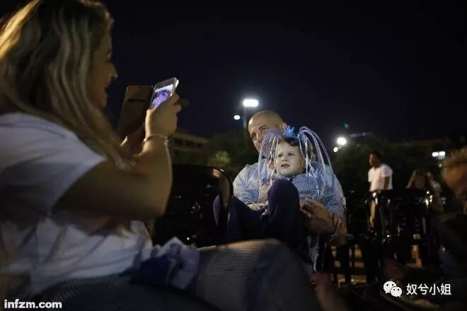 2018年4月18日,以色列特拉维夫,一位母亲为她的孩子拍照,庆祝以色列独立70年