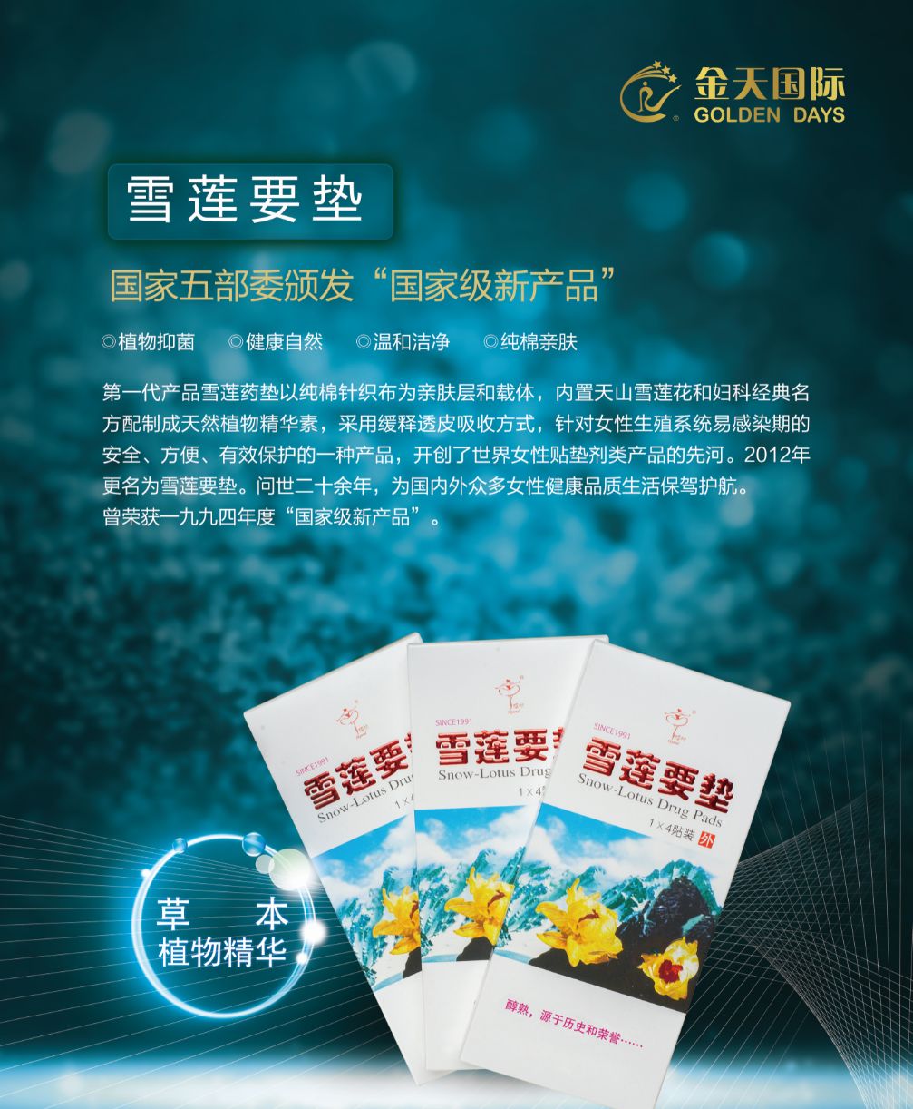 第一代产品雪莲要垫以纯棉针织布为亲肤层和载体,内置天山雪莲花和妇科经典名方配制成天然植物精华素,采用缓释透皮吸收方式,针对女性生殖系统易感染期安全、方便、有效保护的一种产品,开创了世界女性贴垫剂类产品的先河,问世二十余年,为国内外众多女性健康品质生活保驾护航。曾荣获一九九四年度国家级新产品。