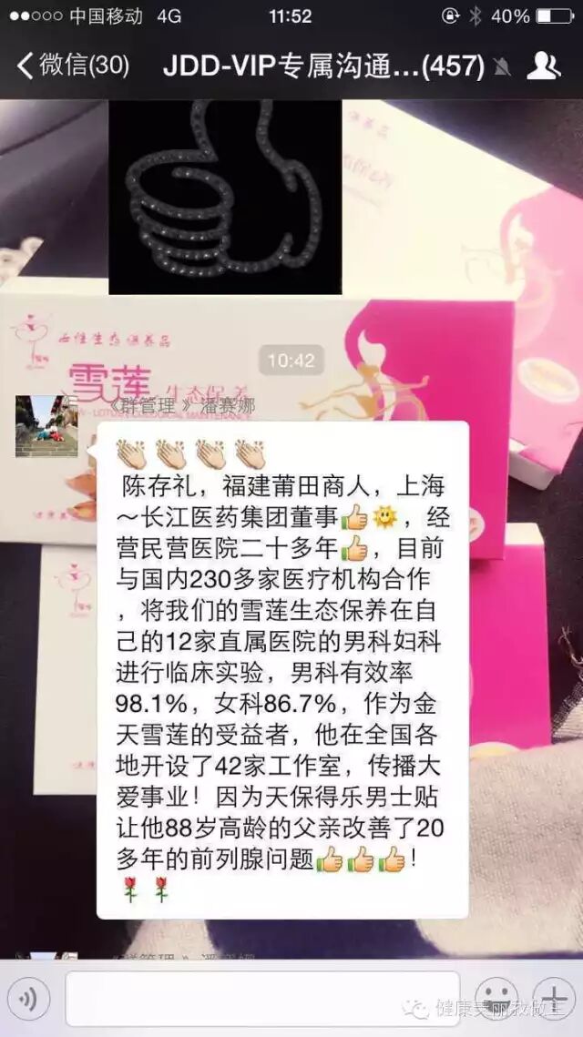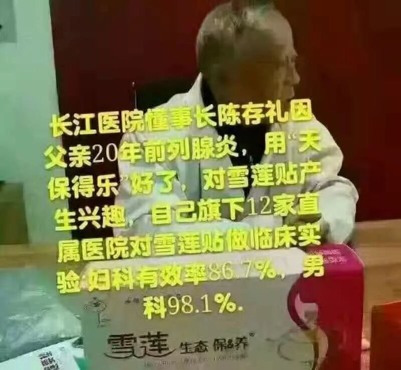 长江医院董事陈存礼,因88岁老父亲用天保得乐调理好了困扰老人20多年的前列腺问题!对雪莲贴产生兴趣,在自己旗下的12家直属医院对雪莲贴进行了大量临床实验,实验结果表明,雪莲贴对妇科有效率86.7%对男科更是达到98.1的有效率!雪莲贴太牛了吧!