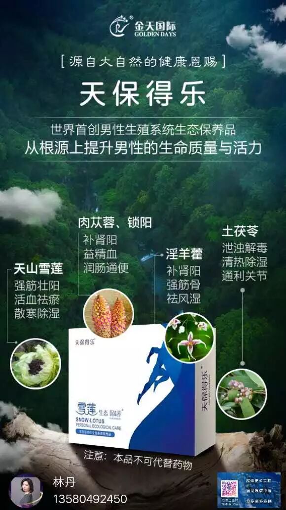天保得乐蕴含以天山雪莲花为核心的39味草本植物精华,在保持男性健康的同时源源不断地为睾丸提供营养物质,修复受损的细胞、组织,激活睾丸的功能,提高雄性激素分泌水平,使男性皮肤滋润、有光泽、淡化色斑、强健体魄,性功能提升、和谐性生活、增强自信心,保持阳刚、睿智、充满活力、男人味十足。
