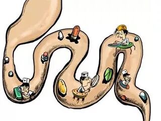 肠道全长共5~7米,每隔3.5厘米就有一个弯折,特别是大肠更是千褶百皱,全面铺开有一个网球场那么大,而且这些皱褶有很强的藏污纳垢能力。