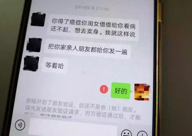 对你进行人身攻击,人格辱骂,各种脏话拖家带口不堪入耳。更有甚者,还会使用更卑劣的手段威胁你,在家门口蹲守,假冒法院递传票、在网上发布你的裸照信息,甚至还有的逼迫女孩卖淫“肉偿”。