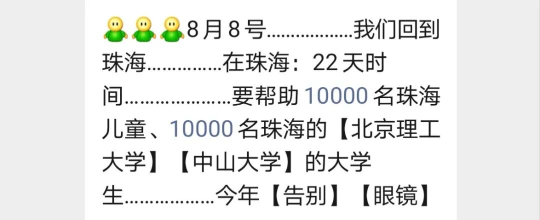 8月8号………………我们回到珠海……………在珠海:22天时间…………………要帮助10000名珠海儿童、10000名珠海的【北京理工大学】【中山大学】的大学生………………今年【告别】【眼镜】………………