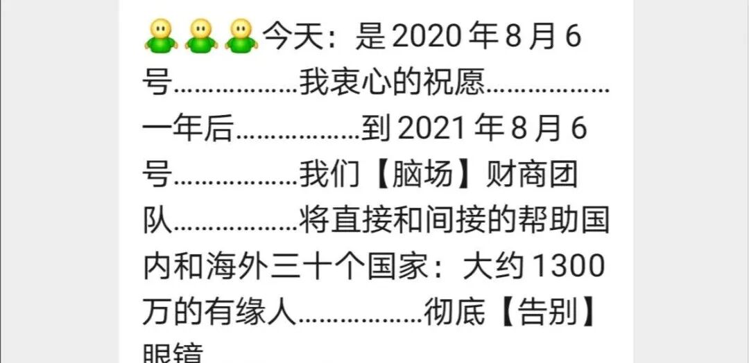 今天:是2020年8月6号………………我衷心的祝愿………………一年后………………到2021年8月6号………………我们【脑场】财商团队………………将直接和间接的帮助国内和海外三十个国家:大约1300万的有缘人………………彻底【告别】眼镜…………………