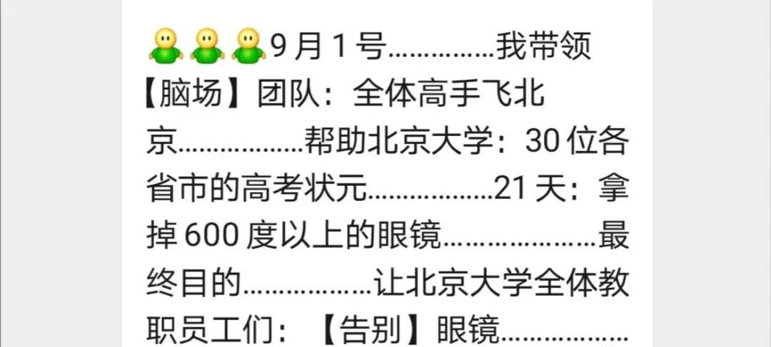 9月1号……………我带领【脑场】团队:全体高手飞北京………………帮助北京大学:30位各省市的高考状元………………21天:拿掉600度以上的眼镜…………………最终目的………………让北京大学全体教职员工们:【告别】眼镜………………