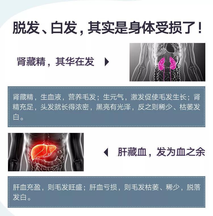 按照中医理论:肾藏精,其华在发;肝藏血,发为血之余;精血不足,黑发不生。白发、脱发是肾虚、气血不足最直观的症状。因此,解决脱发、白发问题,根本在于益气补肾。
