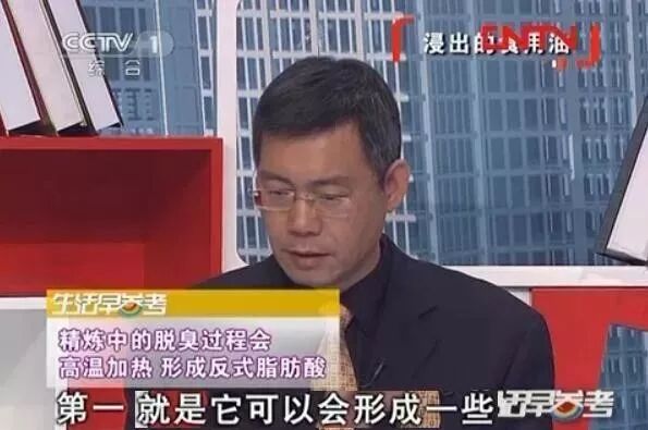 《浸出的食用油》节目中,中国粮油学会油脂分会副会长、江南大学食品学院王兴国教授不得不承认“化学浸出”大豆油高温加热“精炼”过程“形成对人体有害的百分之一点几到百分之三点几的反式脂肪酸,成为中国人反式脂肪酸摄入的主要来源”!