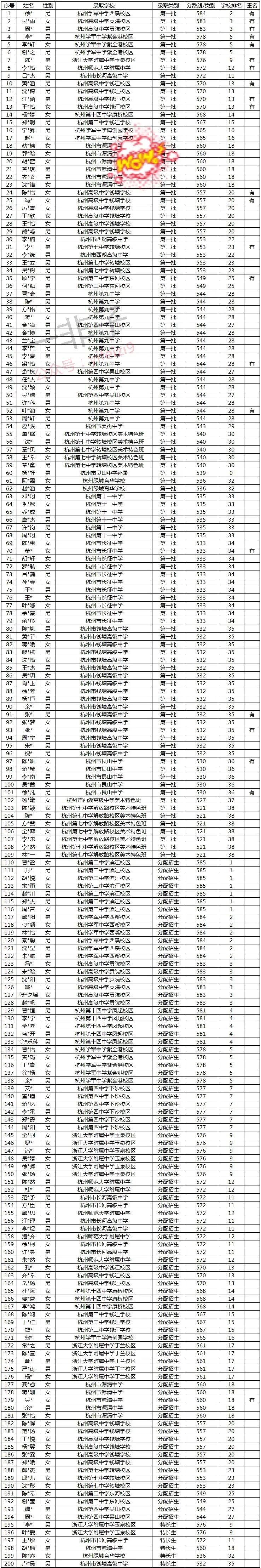 第一批、第一批补录、特长生、分配招生、提前特色班、中外办学、中本一体化、中职自主招生、第二批民办中学(缺杭州市实验外国语学校、杭州国泰外语艺术学校、杭州英才高级中学、杭州云谷学校录取名单)录取名单(以上名单均在杭州教育局网站或各学校网站公布)。因重名原因无法确认毕业学校,汇总数据有重复计算可能。