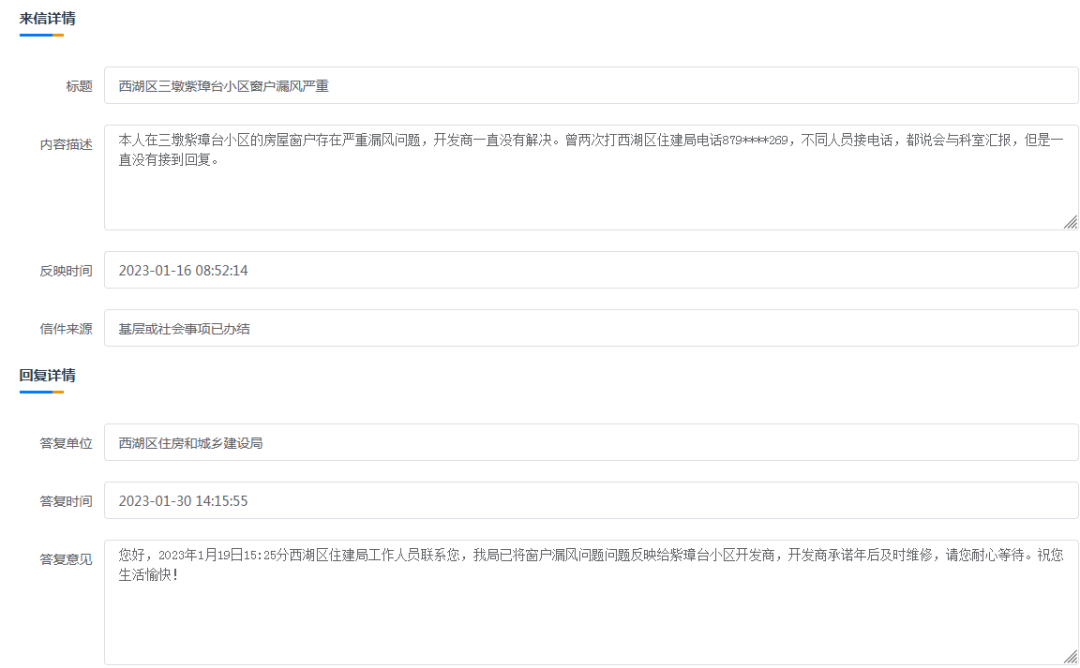 近日,有网民在浙江政务服务网反映:本人在三墩紫璋台小区的房屋窗户存在严重漏风问题,开发商一直没有解决。曾两次打西湖区住建局电话879****269,不同人员接电话,都说会与科室汇报,但是一直没有接到回复。