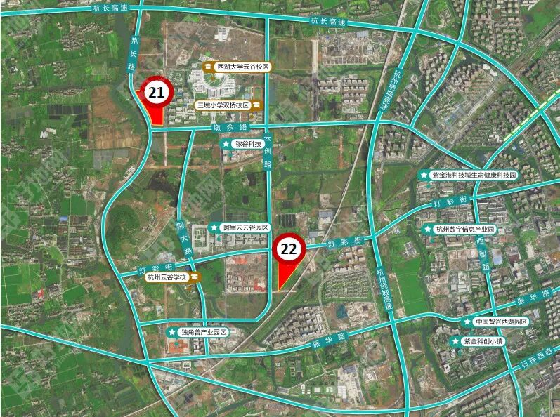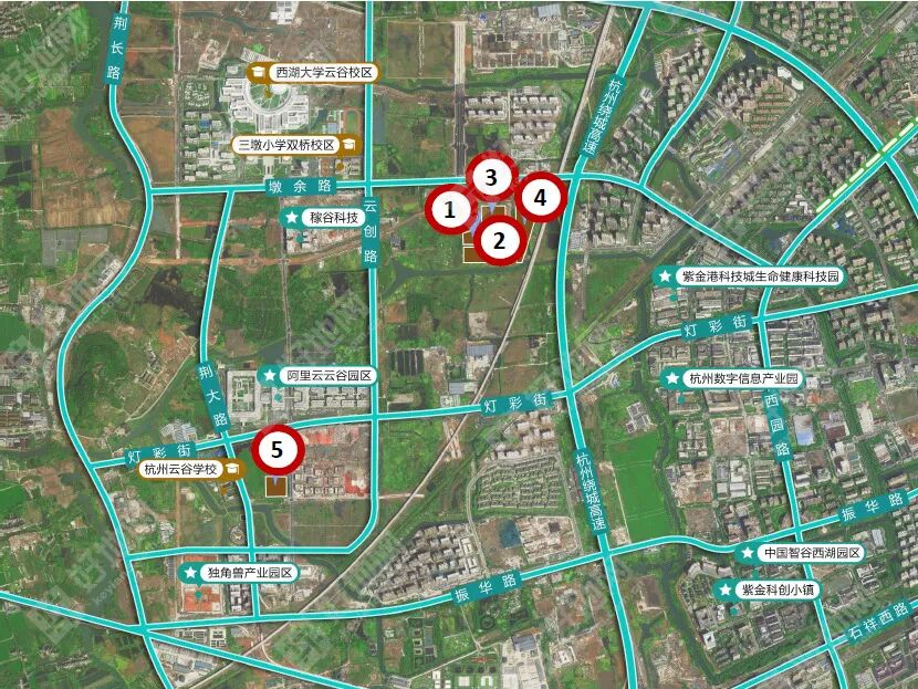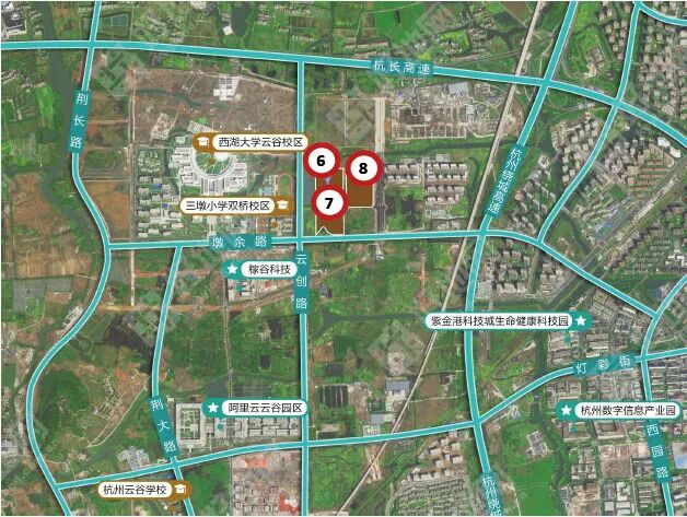 几宗地块位于双桥(云谷)单元西湖大学城,这里是西湖区重点打造的“科学家之城”,西北侧不远即为西湖大学云谷校区,周边还有阿里云计算产业园、菜鸟产业园、独角兽产业园等一大批重点产业平台汇集,产业集聚效应显著。