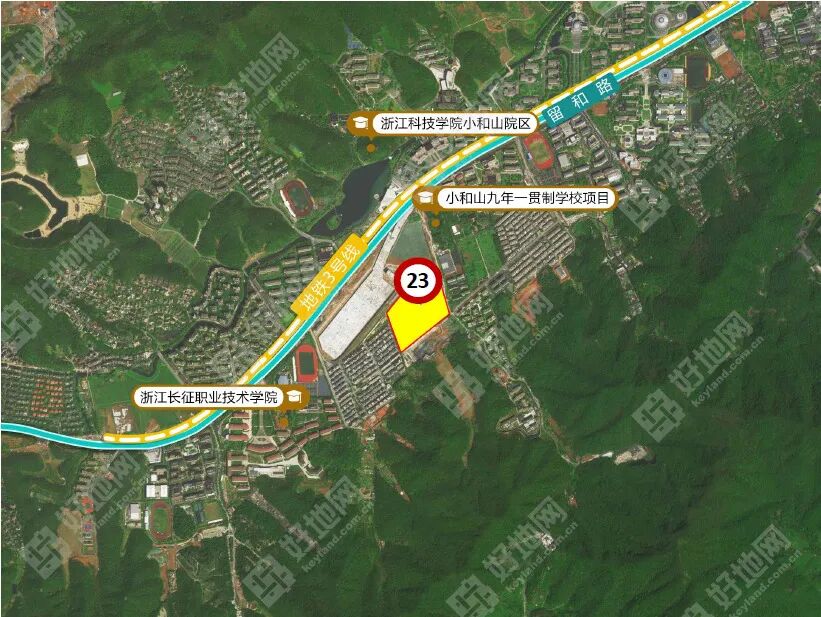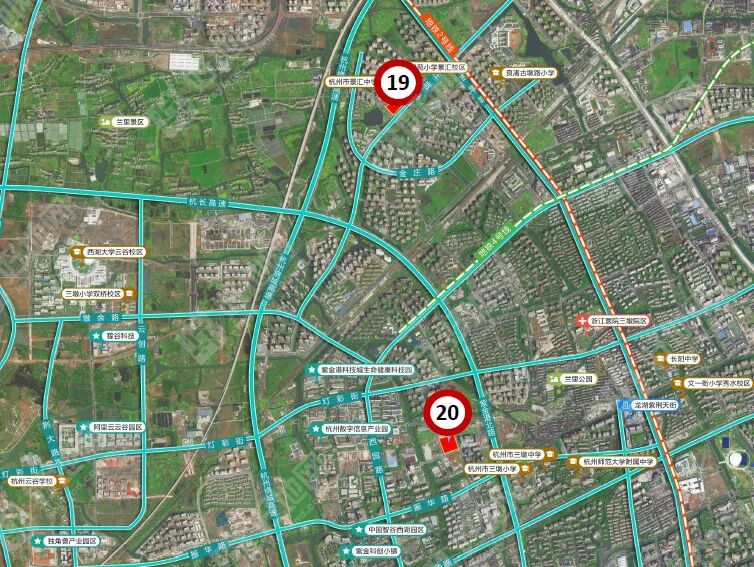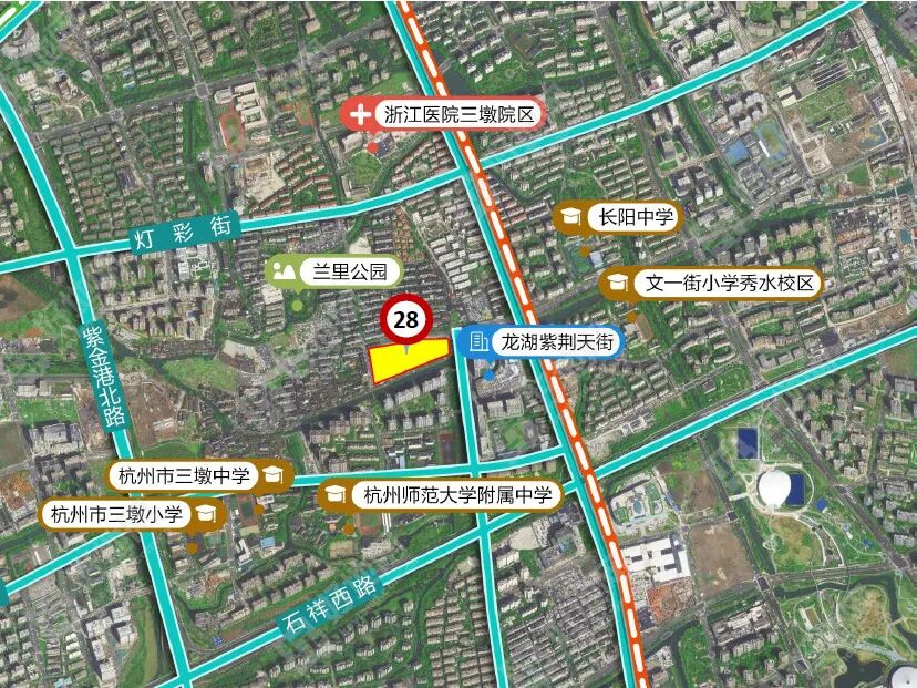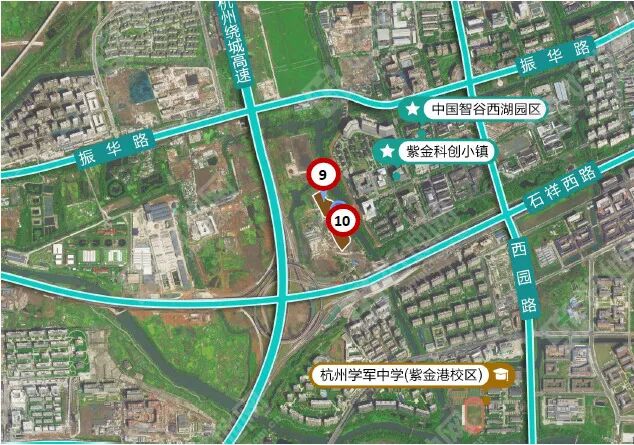 地块位于紫金科创小镇西侧,周边长深高速、石祥西路、振华路等汇聚,交通便捷。地块南面及西面分别有浙大紫金港校区、西湖大学、云谷学校等教育资源配套,有助于产学联动,进一步推动产业发展。