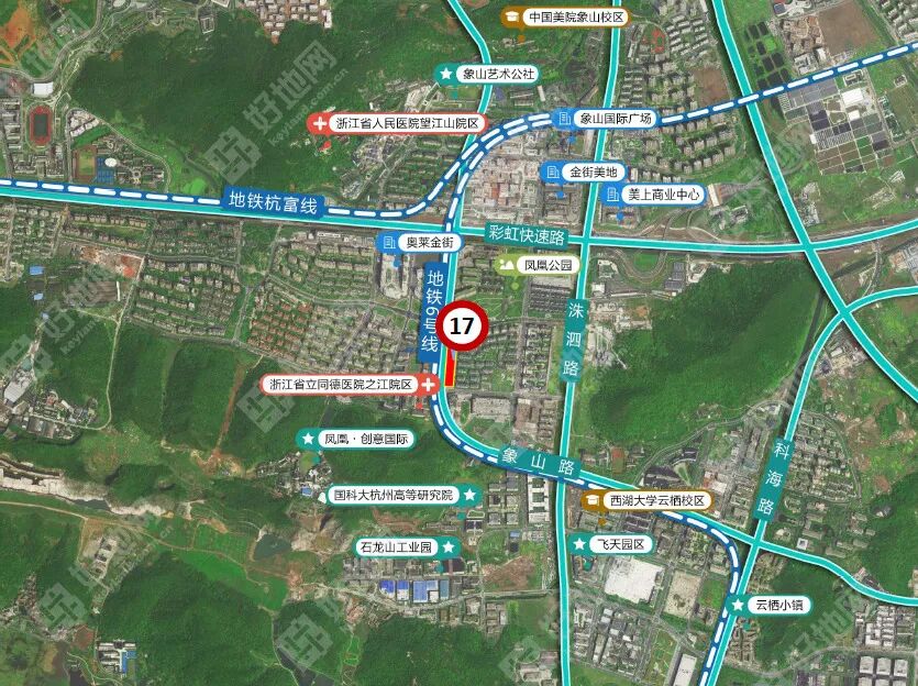 地块位于之江度假区单元核心区,区位优越,东侧不远即为钱塘江岸,南接云栖小镇,西联艺创小镇,可享受多方位产业辐射,助推区域总部经济发展。