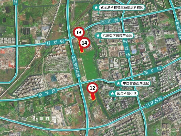紫金科创小镇东西两侧还有4宗地块,三块分布于长深高速沿线,一块临近杭长高速,周边振华路、灯彩街、振中路、西园路等道路纵横交错。
