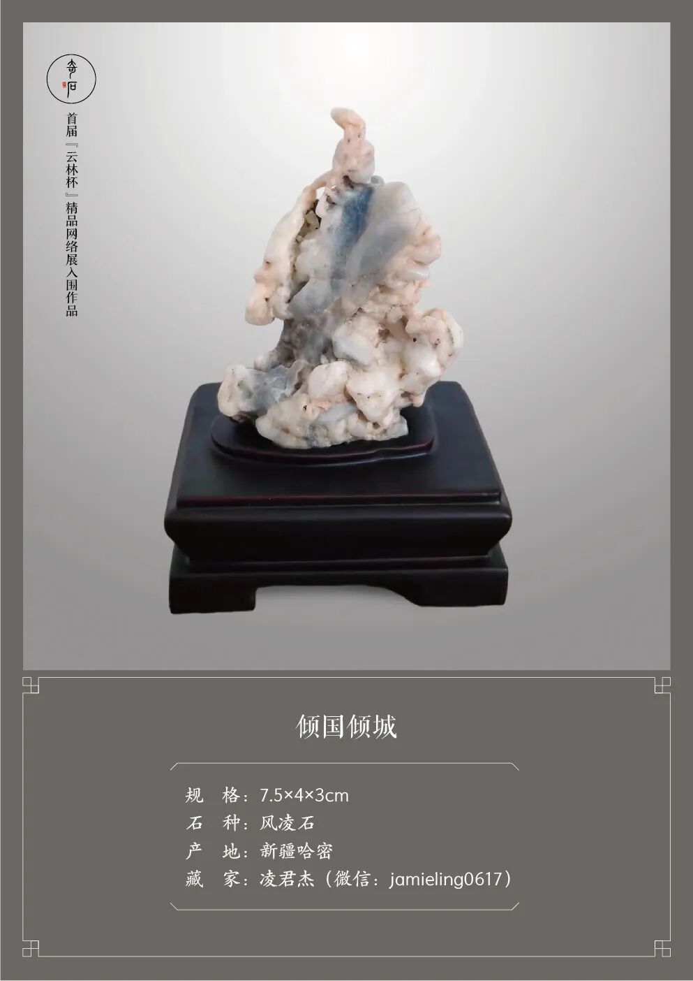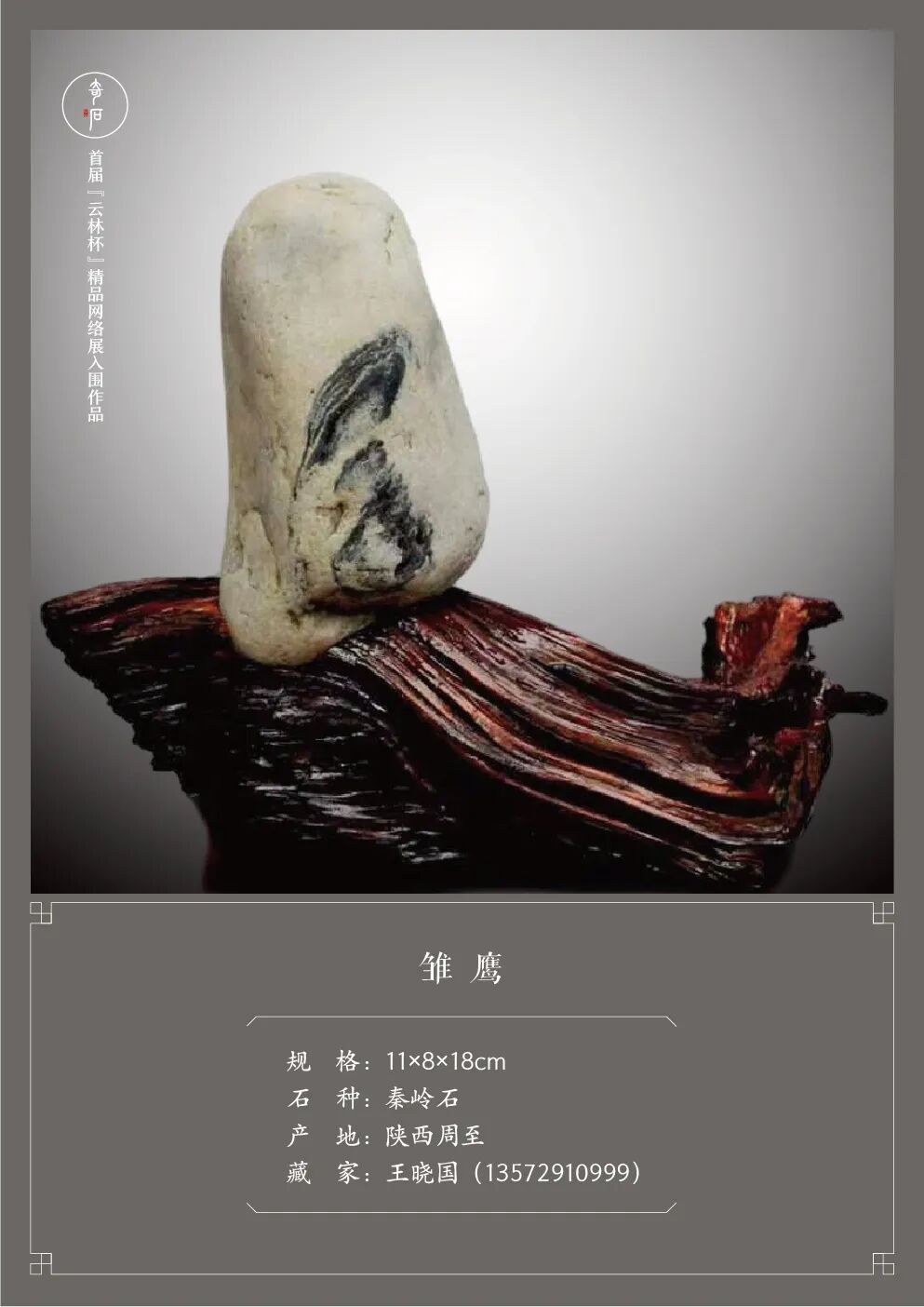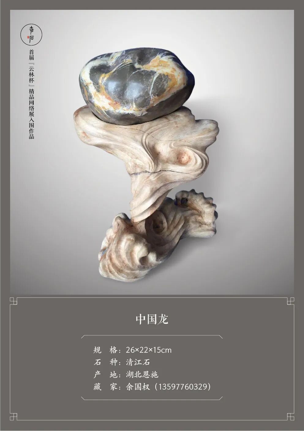 首届“云林杯”精品赏石网络展自启动以来,就受到了全国各地众多新老朋友的广泛关注和大力支持。鉴于“严入围、不评奖”的办展原则,此次活动的入围作品无需等到投稿截止后再进行统一评选,而是严格按照《观赏石鉴评》国标进行分批评定。在我们的外联、编辑、设计师、通联站及评审团的共同努力下,经过二十天的汇总、筛选、评判、沟通、做图等一系列工作,终于能够将新鲜出炉的第一批入围作品呈现给大家了。敬请欣赏!疫情肆虐,石市萧瑟。我们希望通过举办“云林杯”为赏石界多少带来一些活力,给爱石人多少送去一些温暖。敬请期待第二批及第三批入围作品的展播。
