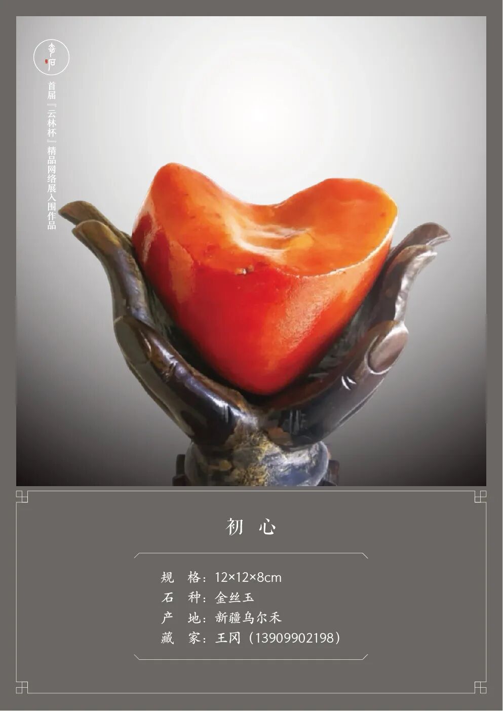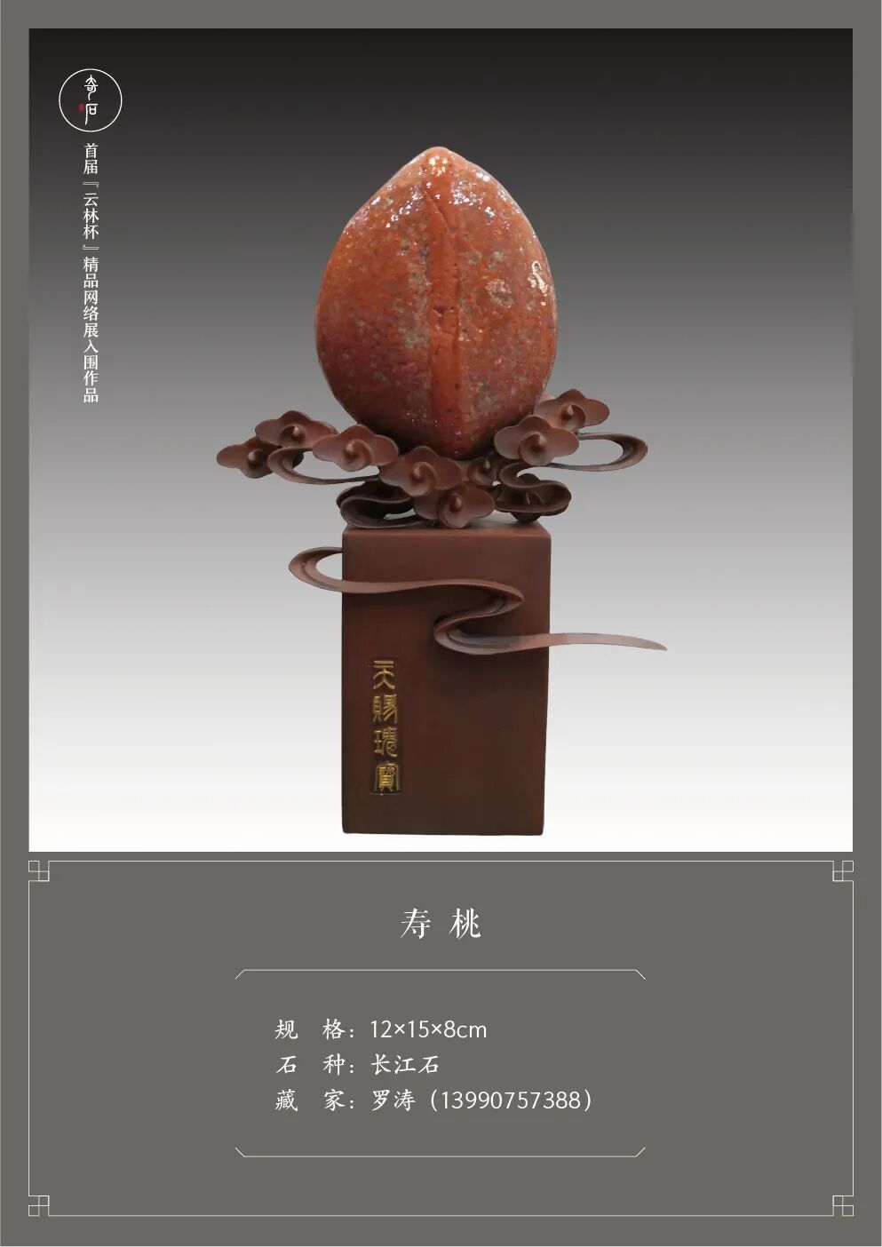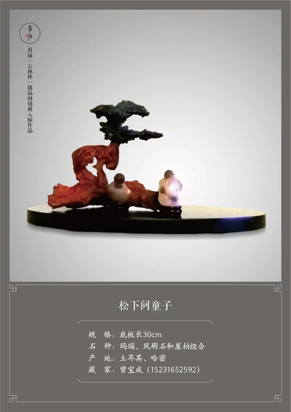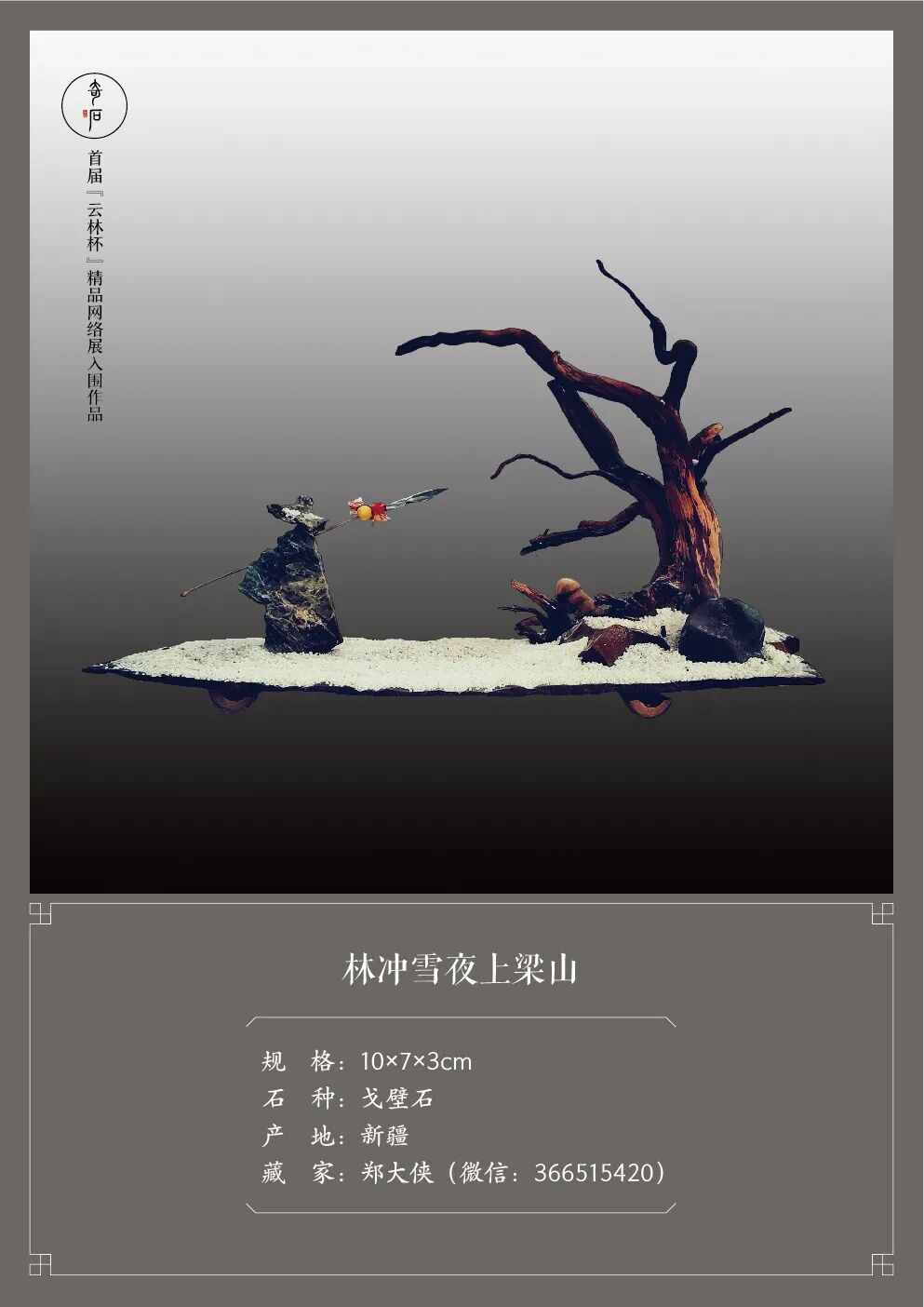 首届“云林杯”精品赏石网络展自启动以来,就受到了全国各地众多新老朋友的广泛关注和大力支持。鉴于“严入围、不评奖”的办展原则,此次活动的入围作品无需等到投稿截止后再进行统一评选,而是严格按照《观赏石鉴评》国标进行分批评定。在我们的外联、编辑、设计师、通联站及评审团的共同努力下,经过二十天的汇总、筛选、评判、沟通、做图等一系列工作,终于能够将新鲜出炉的第一批入围作品呈现给大家了。敬请欣赏!疫情肆虐,石市萧瑟。我们希望通过举办“云林杯”为赏石界多少带来一些活力,给爱石人多少送去一些温暖。敬请期待第二批及第三批入围作品的展播。