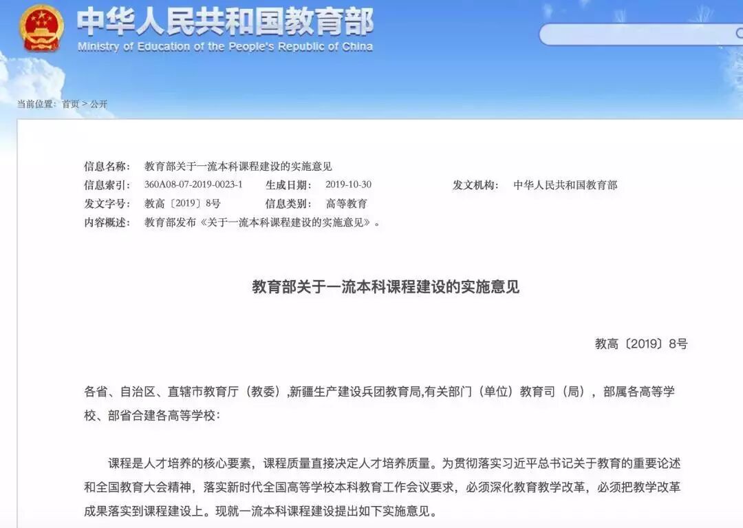 今日,教育部网站公布《关于一流本科课程建设的实施意见》。