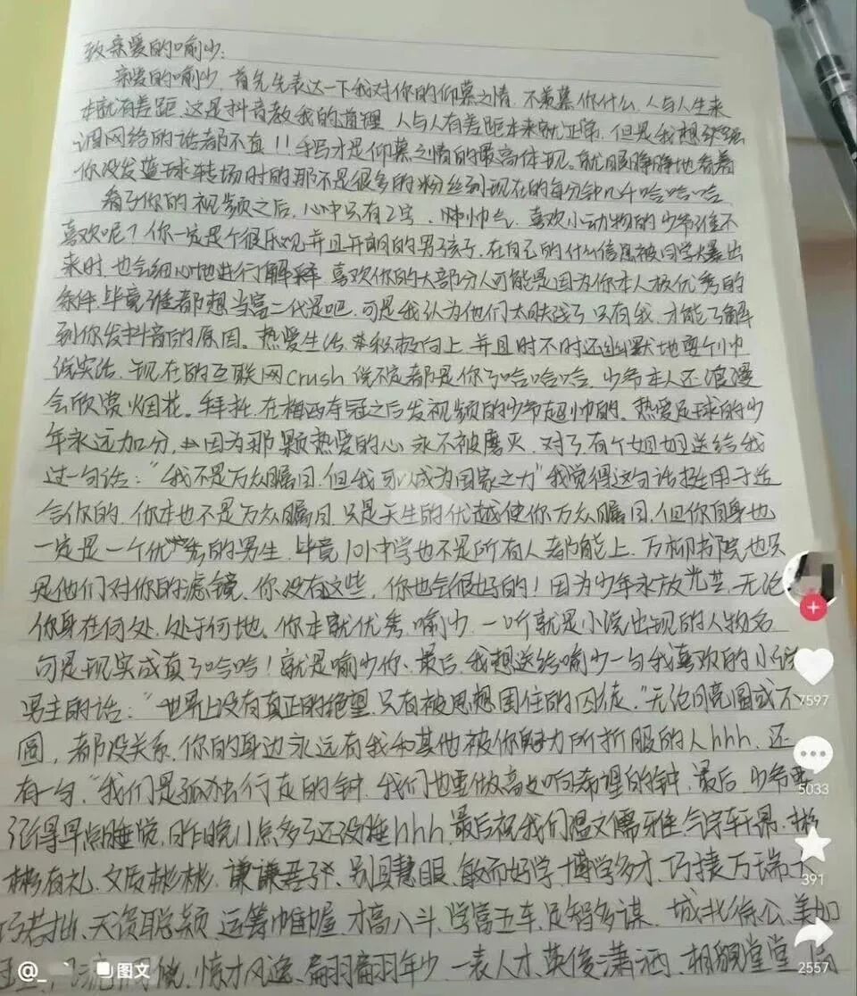 随着视频热度发酵,不堪其扰的Edwinnnnnn删除了运球视频,拒绝了大网红的采访,可见其爆红属于无心插柳。但手写信的横空出世,确实也让“老奴”们也始料未及。据说是一位22岁的小姐姐,对喻少连用45个成语深情告白,结尾还有语法奇怪的中式英语。