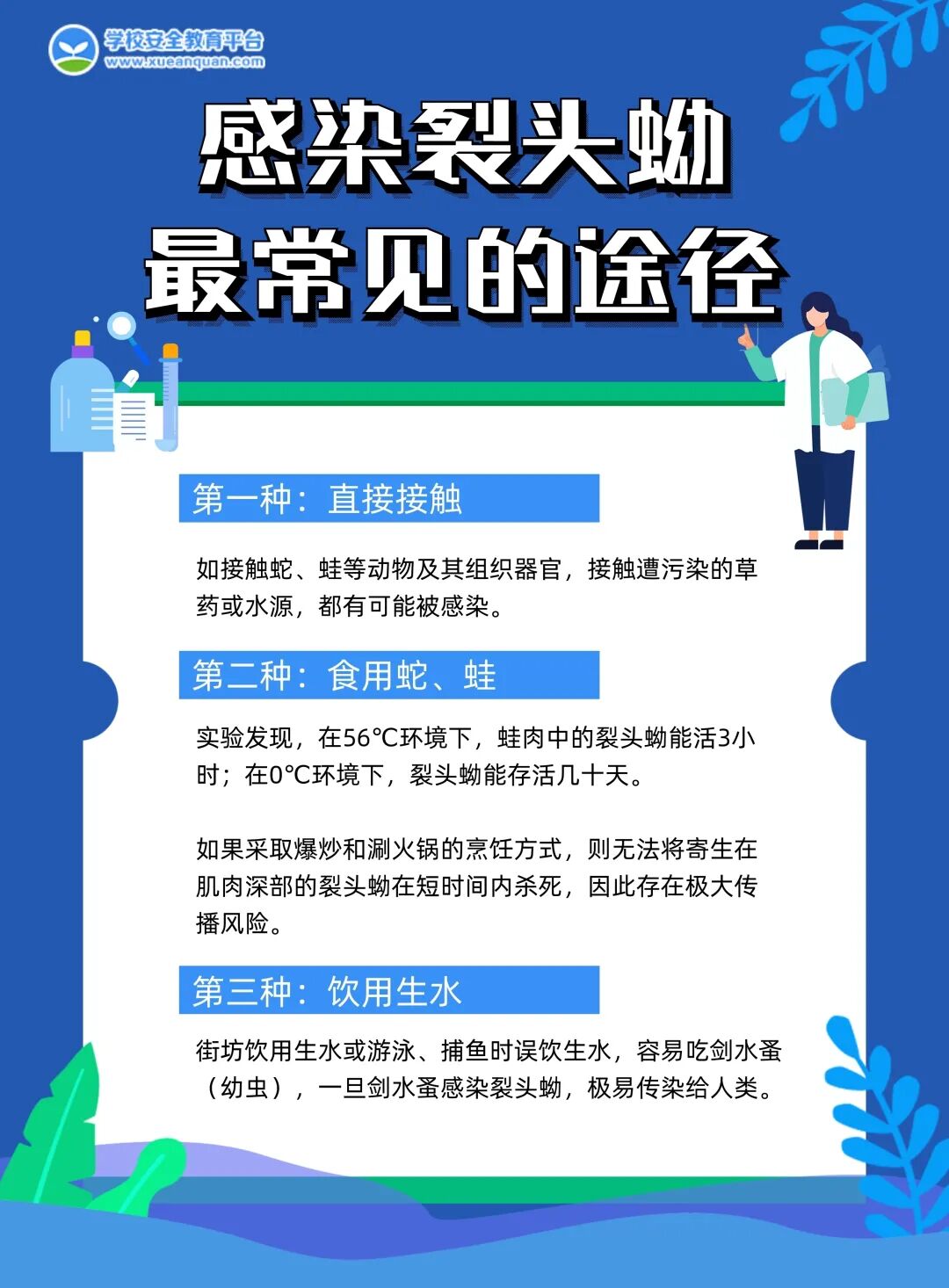 感染裂头蚴最常见途径是让裂头蚴直接接触皮肤,通常有3种方式。