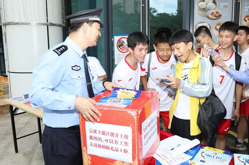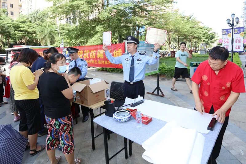 除了发放宣传单、在辖区拉横幅、张贴宣传海报、利用微信朋友圈转发提醒、开展反诈宣传外,“老乔”创新宣传形式,在辖区摆放“派出所民警人像广告牌”,在辖区商业地段开展下载“国家反诈中心”APP现场抽奖、赠送书画作品等活动。