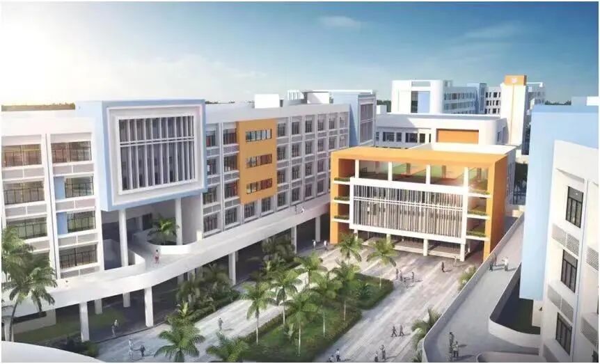 该项目在全国勘察设计大师陈雄的指导下,拟打造成一座满足多元化教学的“聚落校园”,设计方案考虑在尺度、环境、交互、海口文化的多重因素下,塑造公共空间的教学拓展、生活共享与绿色生态等特色。另外,由于校园内含特殊教育学校,项目最初就在校园立面上制定空间引导色彩搭配,通过橙、蓝、绿的点缀颜色,充分利用在特殊儿童校园中的色彩构成,起到良好的治愈和引导作用。