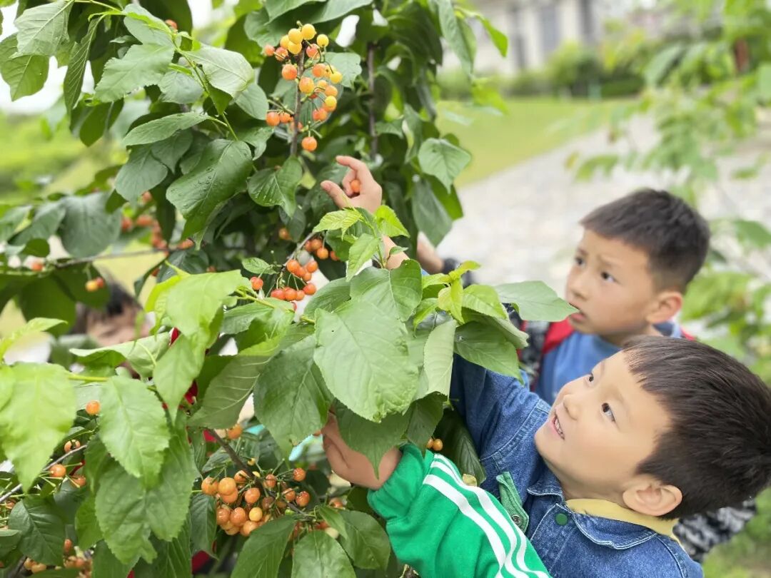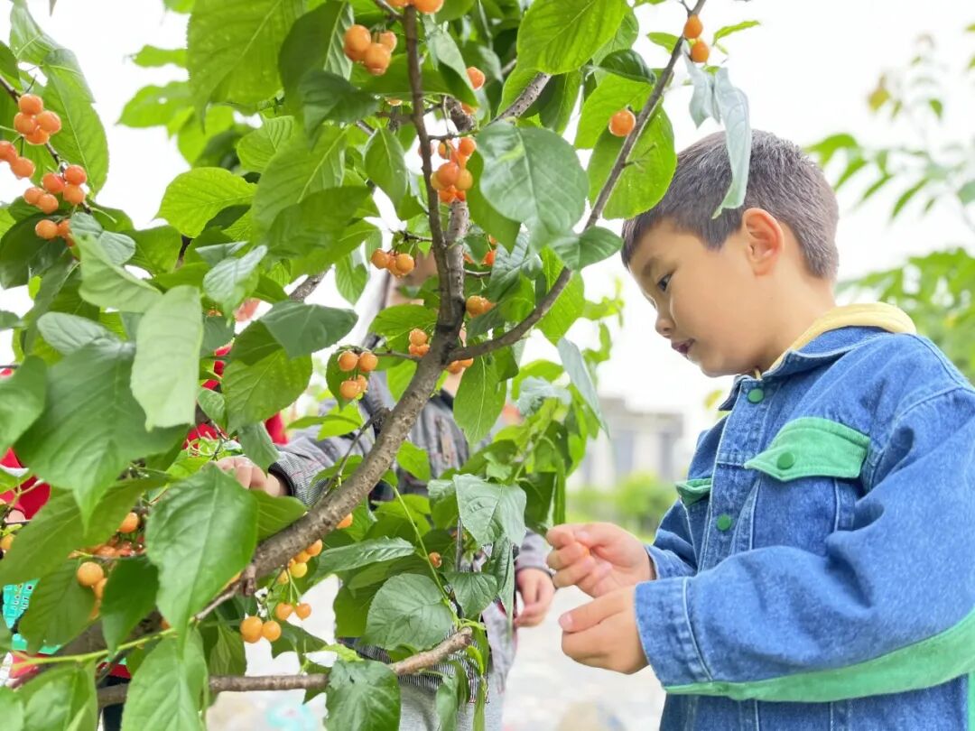 终于,在小朋友们的细心呵护下,圆滚滚的樱桃在四月初的阳光下散发出靓丽的“红”,娇艳欲滴。