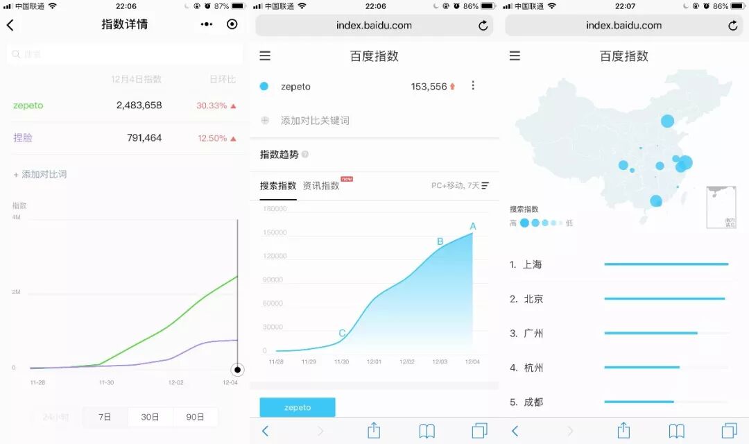 虽然“捏脸对游戏的导量是有用,但很有可能热一把就没了。你看Zepeto的微信指数、百度指数,是12月这几天火起来的,它的区域基本是北上广这些城市,其它地方并没有流行开。基本可以判断是在一个合适的时间点,在一些影响力的人带动下的内容产出而形成的一个爆发现象。”