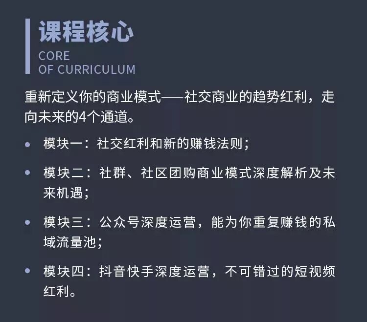 一场大课,两天一晚,四大领域,六大实战派导师倾囊相授,课件经过数月系统打磨,全面掌握最前沿社交商业模式。