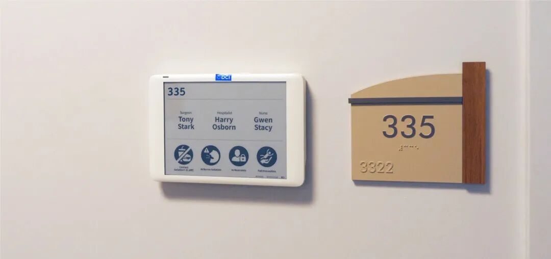 病房门牌:通常是以印刷品显示的诊间或病房号码和指定的医生名字,并使用夹子或胶带贴在诊间或病房外面,更新病房门牌信息也非常耗时。