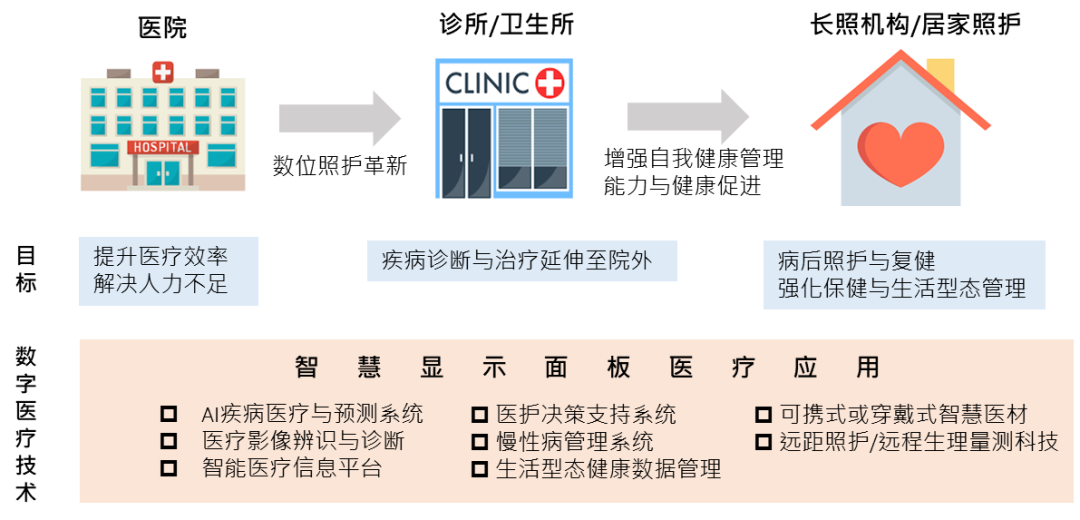 维持这样的大健康照护体系运作,医疗人员需要仰赖各种数字医疗显示科技产品或穿戴式装置,结合物聯网、大數据和人工智能技术,随时掌握病患的健康状况。