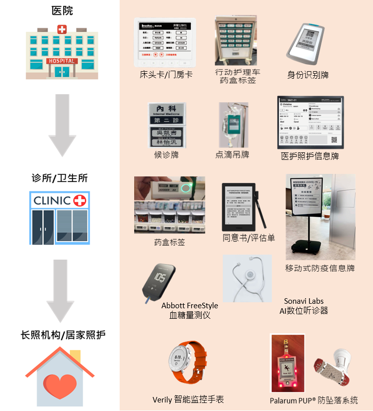 电子纸于智能医疗的应用除了床头卡、门房卡、医护照护信息牌、移动式防疫信息牌、身份识别牌、电子病历本与同意书签署(无纸化窗体系统)之外,也可用于远距照护或穿戴式医疗产品,例如血糖量测仪、生理量测手表、AI数字听诊器与防坠落系统等。