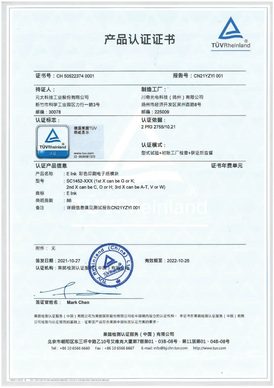 E Ink于今日(10月28日)宣布,旗下E Ink Kaleido™ Plus 彩色电子墨水显示模组荣获国际独立第三方检测、检验和认证机构德国莱茵TÜV大中华区(简称“TÜV莱茵”)颁发“类纸显示”(Paper Like Display)China-mark(中国标识)和Quality-mark双证书,这也是全球首款获此认证的电子纸显示模组。