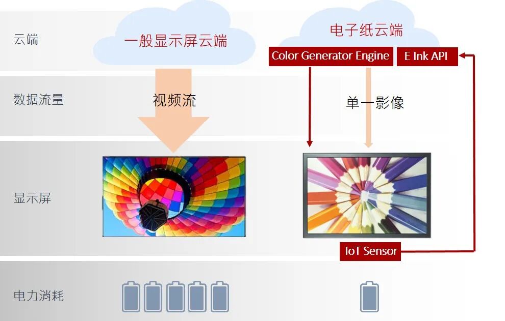 另外,可将电子纸程式介面(API, Application Programming Interface)与彩色讯号发生器(Color Generator)放置于云端,再根据观看者类型或促销投放图片,藉由只下载单一图文件搭配E Ink专属驱动波形 (E Ink Sparkle™),产生类动画吸眼球效果,省去大量带宽以及运算需求,让广告投放应用也能降低碳排。