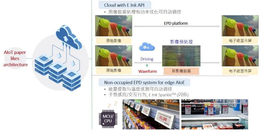 电子纸货价标签里面有微控制器(MCU, Micro Control Unit)、电子纸跟无线射频(RF, Radio frequency),电子纸换完画面就断电,MCU大部分时间处于休眠。假如ESL可以搭配传感器,侦测重量、销售量,或结合温控系统做到节能减排,或透过RF传送数据给卖场云端做AI运算等应用,让小量运算在边缘端完成,大量数据再往云端,或许就能帮云端省电