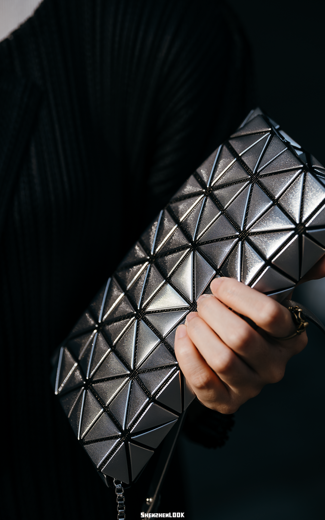 三角片的等边特质,使其能在平面与立体之间切换自如。平放时,扁如纸片形如棋盘,立起时,三角片的平整稳固,也能将包身妥帖支撑起来。