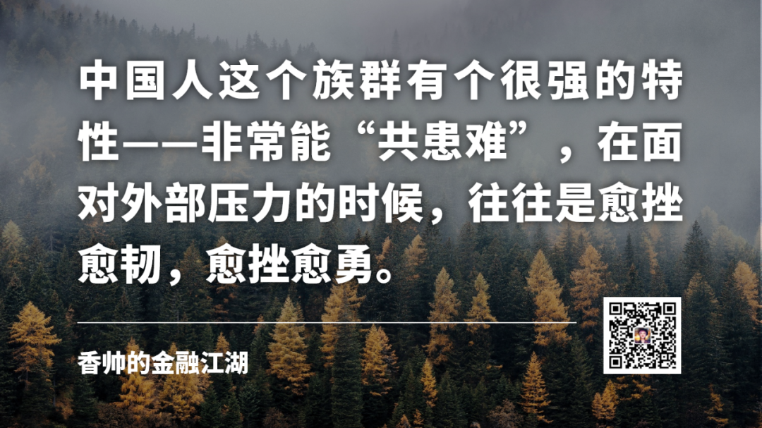 之前我在《熟经济》中就讲过,中国人这个族群有个很强的特性——非常能“共患难”,在面对外部压力的时候,往往是愈挫愈韧,愈挫愈勇。