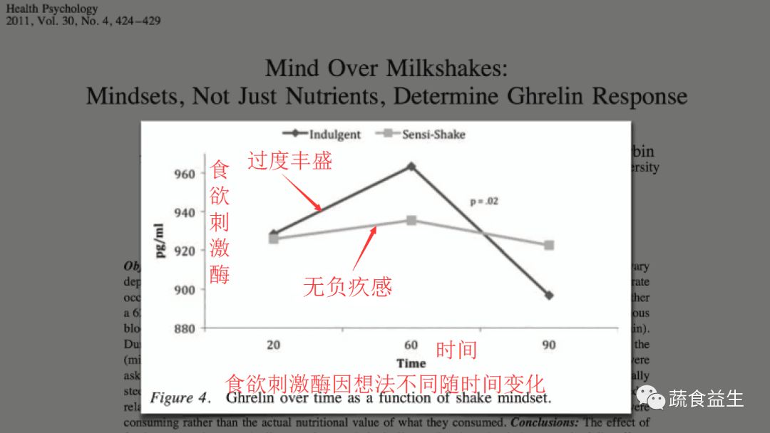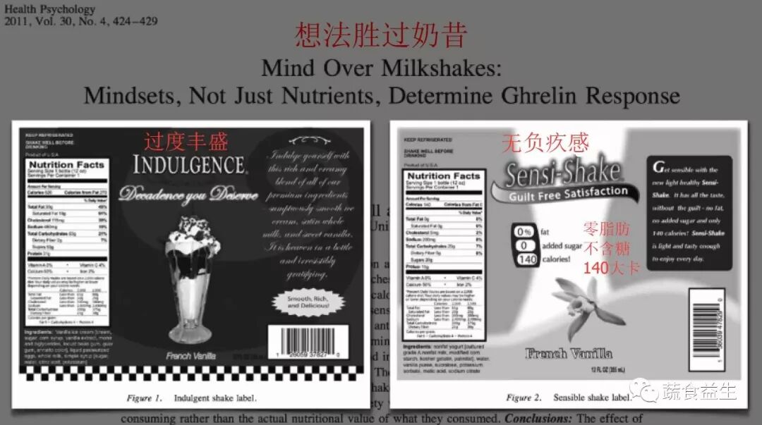 在这个著名研究中,“想法胜过奶昔”,如果提供2杯奶昔,1杯描述成“过度丰盛”,另1杯描述成“无负罪感”,人就会有不同的激素分泌,即使两杯奶昔是完全一样的。