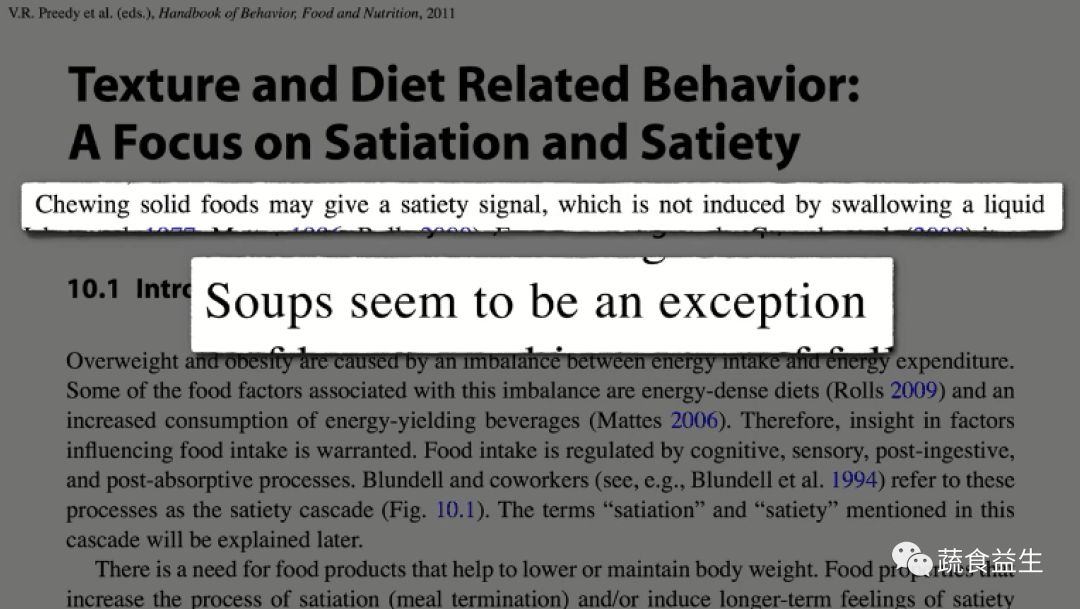 汤,搅碎成糊状的汤,特别是搅碎的蔬菜热汤比同样的块状蔬菜更有饱腹感。