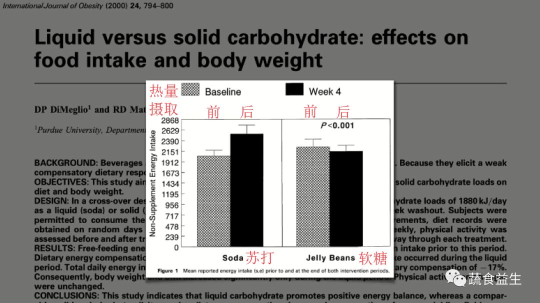 但是在苏打组,这是试验前的热量摄取(左边灰色),尽管多喝了苏打,但每天还是吃同样多的食物。
